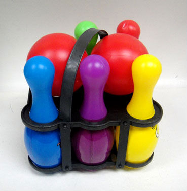 Your kids must love this colorful toy bowling set. This bowling set flaunts five bowling pin bottles in assorted colors and two red balls, which are all held in the plastic holder attached for easy storage. The black storage case is paired with a handle, making the whole bowling set an easy carrying toy set.