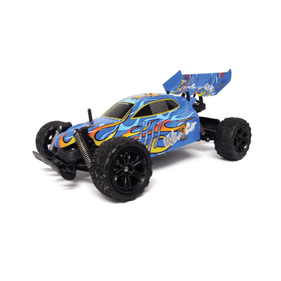 This toy car comes with a cool and trendy design. It features a blue body with eye-catching patterns. This toy car is designed with robust wheels for easy movement.