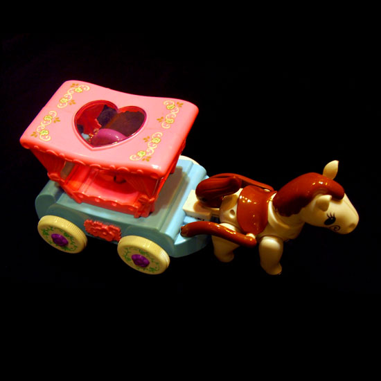 The colorful toy carriage is pulled by a lovely horse in front. The wagon features a nice heart shape and delicate decorative patterns. This toy is suitable for players aged 3 years old and above.
