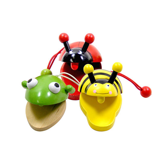 These castanets come in a frog, ladybug and bee shape. They are held in the hand and used to produce clicks for rhythmic accents. Made from quality wood, these castanets are durable and not easy to break.