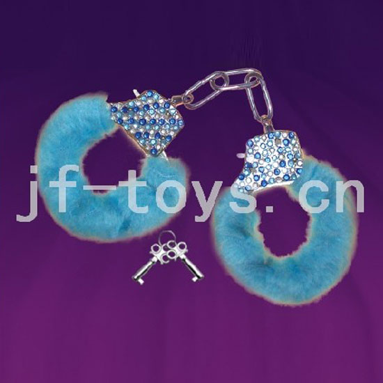 Featured is a pair of toy handcuffs designed in blue. The blue fluffy cuffs come with locks decorated with blue and white diamond-like stones. The pair makes great role-play toys in Halloween or theme parties.