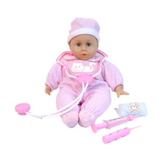This is a baby doll featuring with medical set. The medical set features a stethoscope and syringe. Children can play doctor and patient with the doll. The doll and the medical set are match with a similar colour theme and size. The baby doll is very adorable.