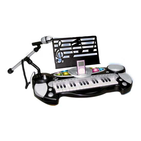 Shown here is a toy electric piano featuring 32 keys. It is fitted with a microphone for singing. The piano also gives dynamic disco light effects for enhanced musical amusement.