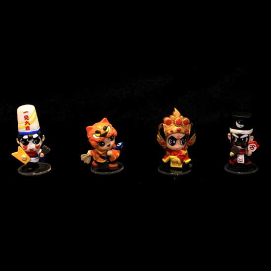 Shown here are four toy figures made of plastic. They feature different Oriental roles that look interesting to children. They can be placed on your room shelf as cute display items.