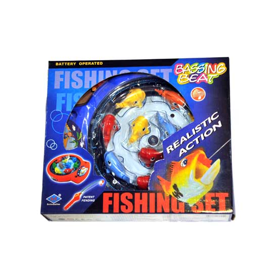 This is a toy fishing set packaged in a window box. It features a durable fish tank, several colorful fishes and a fishing rod. The fishing set is battery operated for added fun.