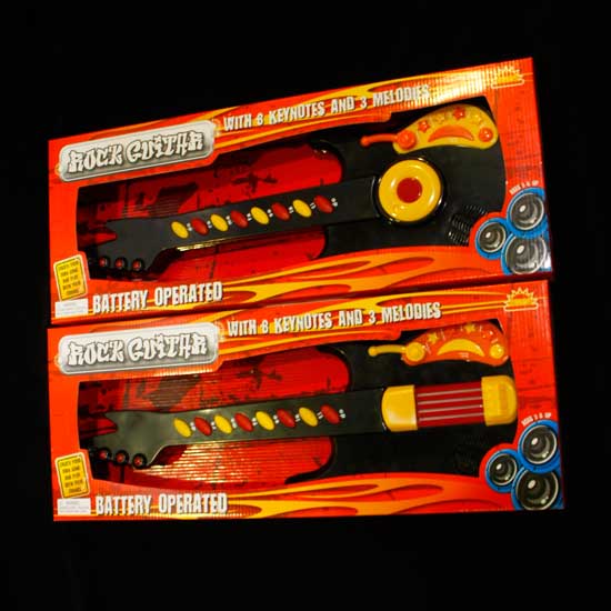 The highlighted toy guitar is powered by 4 X AA-size batteries. It is recommended that batteries of the same or equivalent type are to be used. Let children enjoy the fun of playing instrument with this plastic toy guitar.
