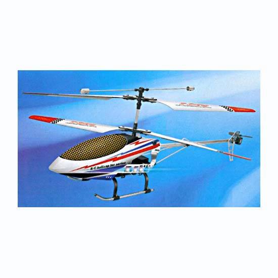 This unique helicopter features a futuristic white-colored construction with blue and red zigzag patterns. It boasts a double propeller design. It is one of the best showcase models for any aircraft and remote-controlled toy enthusiasts.