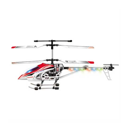Displayed is a toy helicopter that uses remote control for navigation. The body of the helicopter is designed colorfully and the tail boom has lights on when the helicopter flies. This fun toy helicopter is a good choice for your children and family.