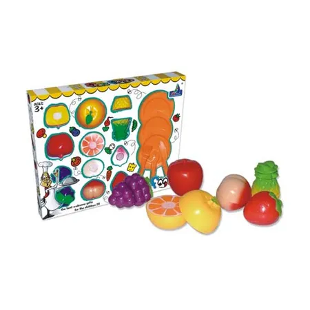This displayed imitation food playset is designed for kids to have fun. The playset comes with grapes, an orange, a strawberry, a peach, an apple, a pineapple, etc. This toy imitation food set is fun to play with.