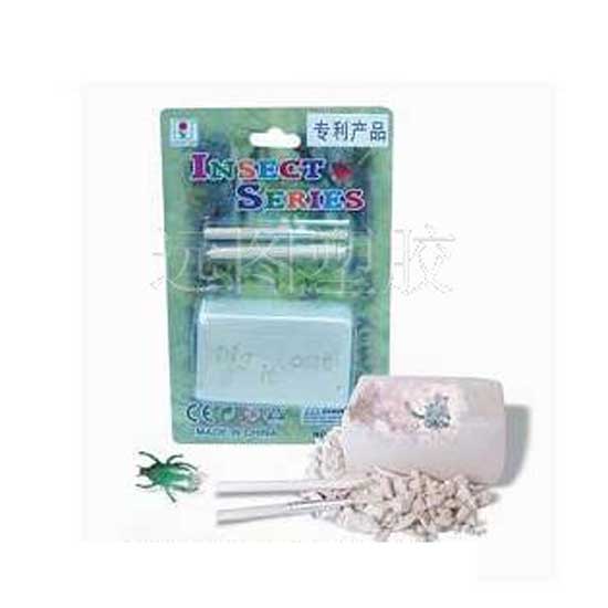 Pictured is a toy insect playset that includes a dough and a digging tool. Dig the dough and you will discover a life-like insect in it. This fantastic toy insect playset is sure to amaze your little one.