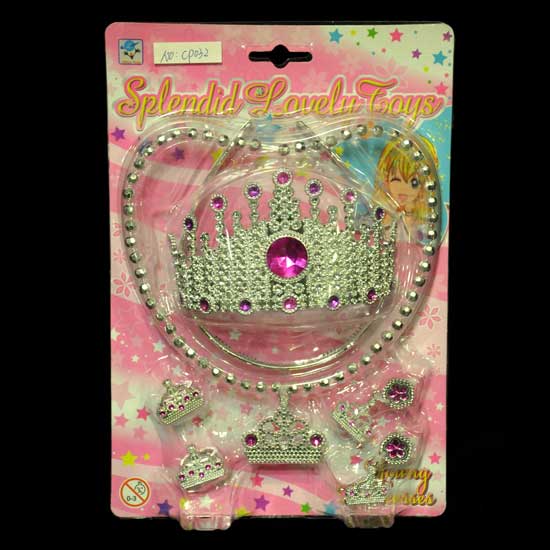 Shown here is a toy jewelry set featuring a princes theme. The pieces of jewelry are embellished with diamond-like trimmings for enhanced attractiveness. Spruce up your daughter for coming dress-up parties and children's gatherings with these splendid pieces.