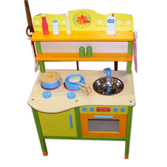 The wood kitchen set is designed with a realistic outlook. Moreover, accessories, such as drawers, an oven, a sinker and pans, are included. Furthermore, imitation food are also included.
