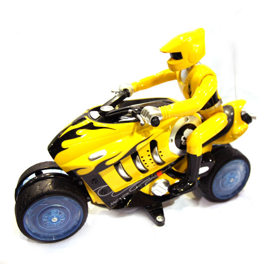 This realistic model toy features the design of a motorcycle with a rider. The stylish toy motorcycle showcases streamlined construction in a sharp yellow color. This toy motorcycle keeps your kids entertained for hours.