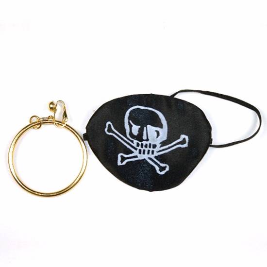 This is a set of toy pirates accessories which included an ear-ring and eye-mask. The ear-ring is in golden giant circle and the eye-mask is in black that has the recognize pirate sign designate on the surface. Mainly they are made up of plastic and cloth materials.
