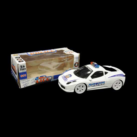 This is a 1:24 toy police car featuring a white and blue appearance. It is designed with music and flashing light for a gorgeous look. This battery-operated toy police car is a great gift for your little one.