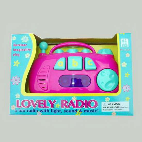 This toy radio comes in a cute curvy shape to please children’s eyes. The glossy plastic shell is designed in sharp pink and teal to catch attention. This radio features light, sound and music functions to keep children amused.