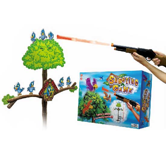 Displayed is a toy shooting game features a safari theme with a colorful design. Simply shoot down the toy birds that perch on the tree to score. This easy and fun shooting game is a good choice for families and friends.