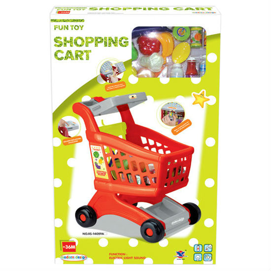 Featured is a plastic toy shopping cart in a multi-color construction. It comes with accessories such as toy food, tea cups, etc. This toy shopping cart set is an excellent toy for children’s role-play games.
