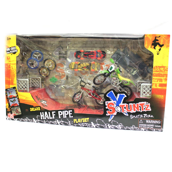 Featured is a set of toys with a skate park-themed design. The miniature bikes and skateboards are well built with die-cast plastic. Fun yet sturdy ramps and rails are included in the set for your kids to play with.