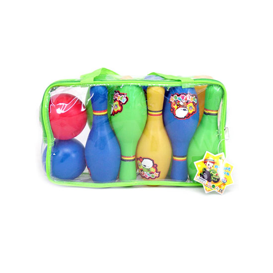 This is a bowling set packaged in a clear bag with handles. The colorful appearance appeals to little children instantly. This set is also adorned with colorful patterns for added cuteness.