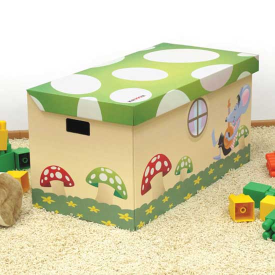 This toy storage box is printed with cute mouse and mushroom patterns for an appealing design. It comes in a large size with a long structure for a large holding capacity. The side handles enable easy carrying.