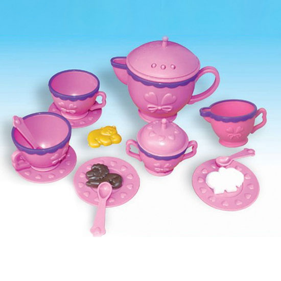 This tea set toy features pink cups with contrasting purple rims. Specially designed with ergonomic handles, the cups are easy to carry. The plates decorated with heart-shaped patterns are sure to arouse girls’ attention.