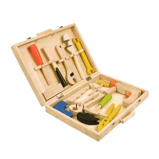This toy tool box set comes with everything a little carpenter needs, including saws, hammers, hatchets and screwdrivers. The tools are made of solid rubber wood with enhanced safety and lasting beauty. This toy box simply teaches children all the great functions of tools.