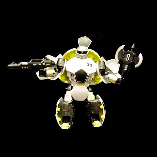 This toy transformer can become a cool robot instantly. The black and white robot is holding a gun and a spear in his hands to be ready to combat. This captivating toy transformer robot is an ideal gift for kids.