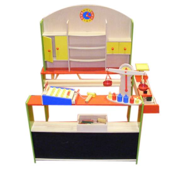 The wood toy furniture is composed of a 3 layers book shelf, a clock and a cupboard. Moreover, a toy tray is attached for children to have fun. Furthermore, a toy calculator is also attached.