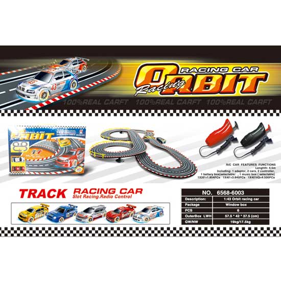 This road racing set includes a sophisticated 4.5-meter track system with two realistic 1:43 racing cars. The radio controlled racing cars are able to produce eye-catching lighting effects. The deluxe track and racing car set makes a great birthday gift choice for boys.