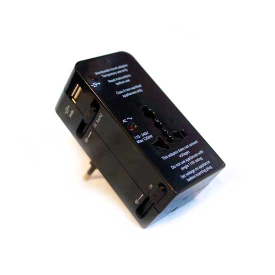 Showcased is a rectangular universal travel adapter designed with a 5V USB plug. Its compact size makes it a great choice for travelers worldwide. Simply slide out the appropriate pins when charging.