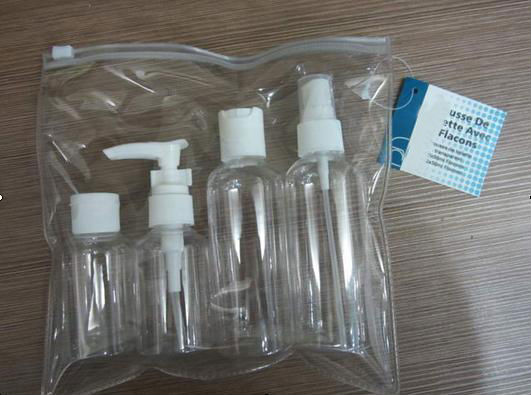 - 1pc 50ml PET bottle with flip cap, 1pc 50ml PET bottle with lotion pump, 1pc 100ml PET bottle with press cap and 1pc 100ml PET bottle with sprayer.
