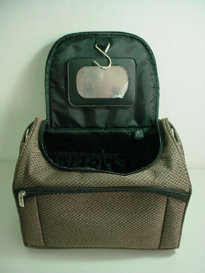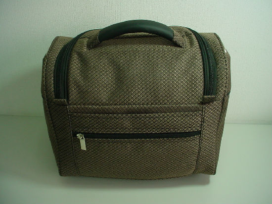 Train case outer made of high grade polyester fabric with leather look PU trimming and handle.