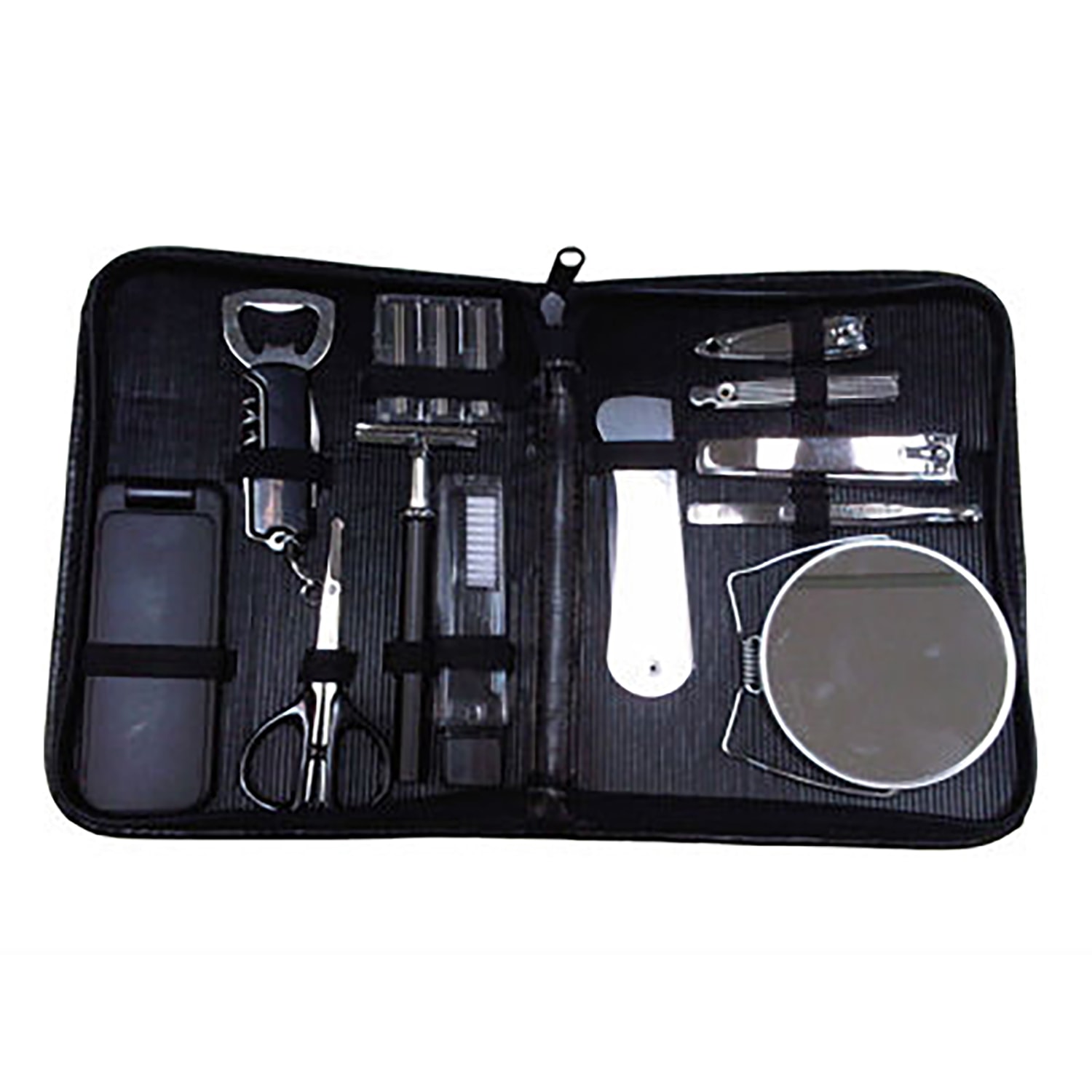 • Pack with a pair of scissors, nail scissors, toe scissors, mirror, comb, foldable toothbrush, razor, razor blade, multi-function bottle opener.