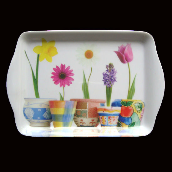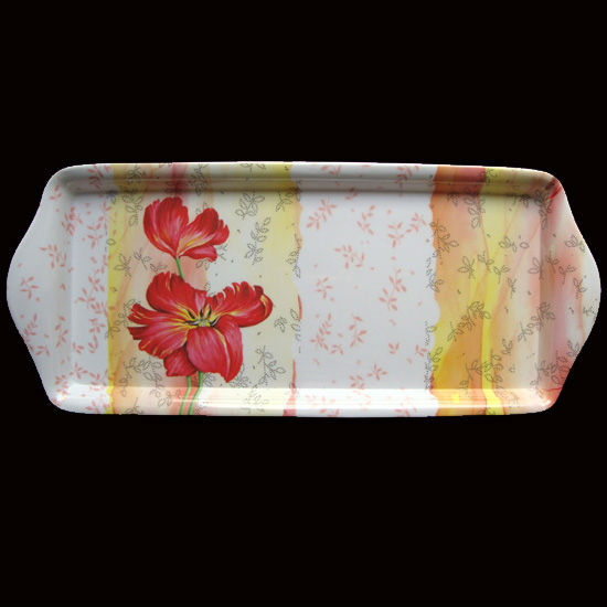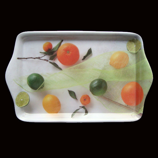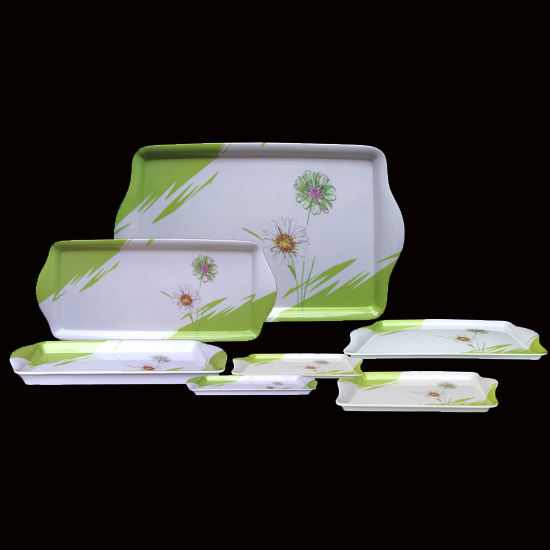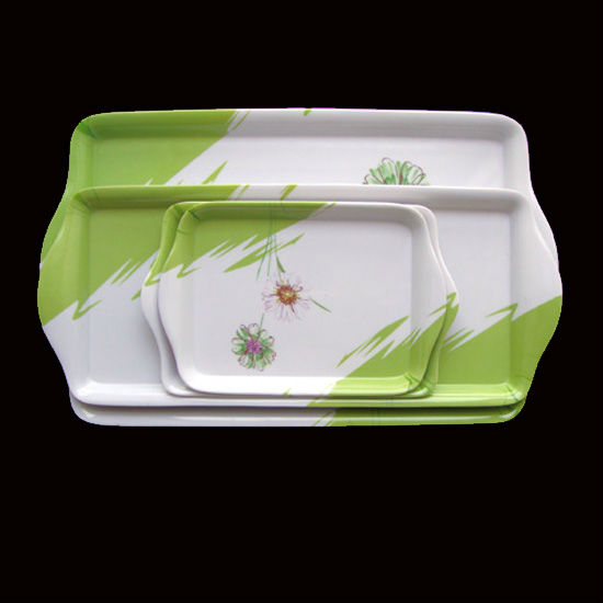 Displayed here are melamine trays with 30% and 100% melamine; 8 sizes available for this shape; welcome customer's decal or color.