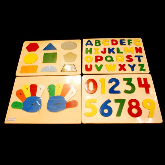 Outlined are four tray puzzles with rugged wooden construction. They feature different educational themes, including English letters, numbers, geometric shapes, etc. The puzzles are suitable for 3 years old and above players.