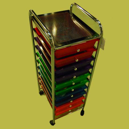 Here showcased is a tray rack with 10 tiers of rugged construction. Each tier is equipped with a tray of a different color for storing sundry items. The casters enable you to move it with no hassle.