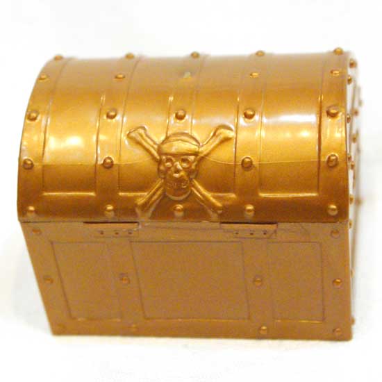 Displayed here is a golden treasure box that comes with plastic coins. This treasure box is a great joking toy for tricking your friends. It offers enhanced fun and amusement for people to play with.