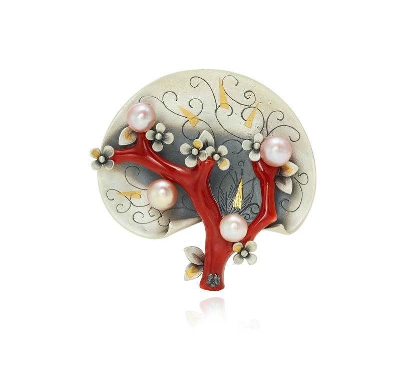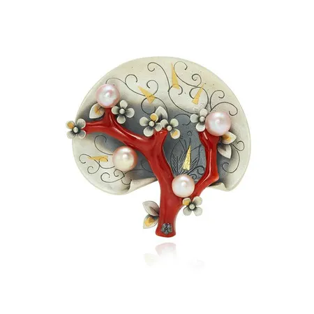 Handmade silver brooch made with coral and fresh water pearl.