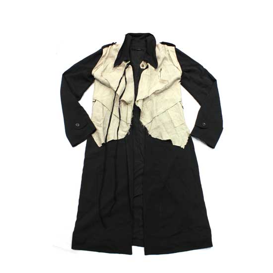 Featured is a trench coat made of vintage-looking fabric and natural linen fabric on the front. It comes with a front opening with a hook closure. This versatile trench coat is a piece of great outerwear for fall and winter.