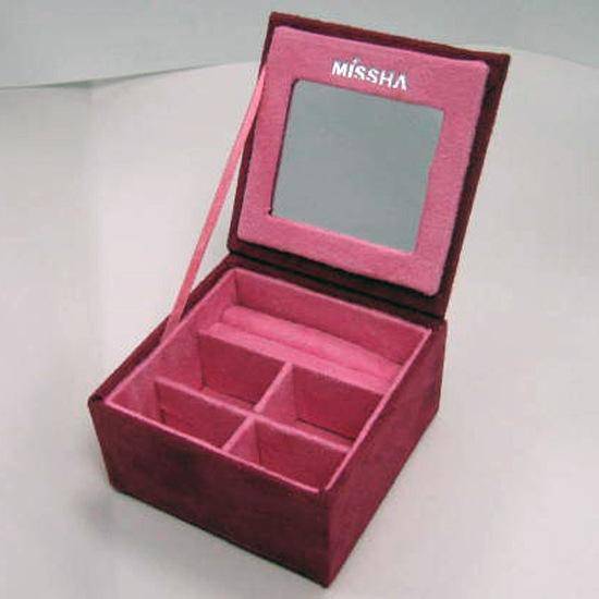 The square-shaped trinket box with a mirror features red exterior covering and multiple interior compartments in pink. The ring holder and four separate compartments enable ladies' to store their jewelry and cosmetics in a neat manner. It is a great accessory for ladies' bedroom.