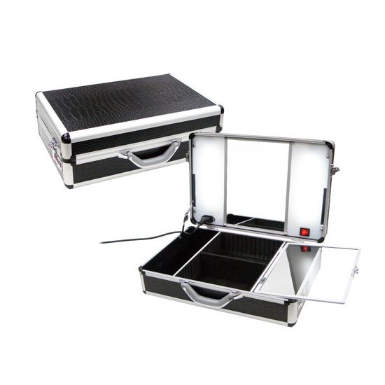 - Durably constructed travel train case highlighted by its foldable mirror and multiple divisions.