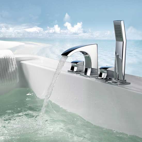 This double-handle tub faucet with a hand shower is designed to fashionably match your bathroom decor. The flat-top faucet features a solid metal construction for durability and reliability. It comes with a powerful spout that fills up your tub quickly.