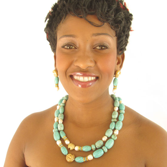 This handmade necklace comes with two strings. It is crafted of assorted turquoise stones and accented with pearls and golden elements. This necklace is made with excellent craftsmanship and attention to detail.