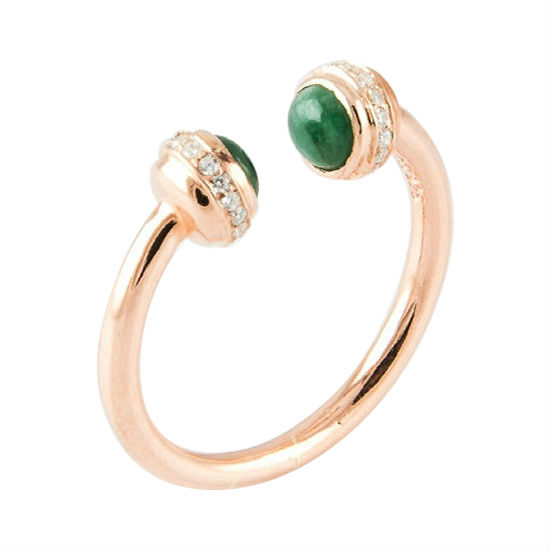 Captivating and gorgeous, the ring hugs your finger with an elegant, open design accentuated with perfectly polished pieces of jades at each end. The sparkling cubic zirconia stones studded around the jade further flaunt a romantic flair for your very essence of femininity in any setting.