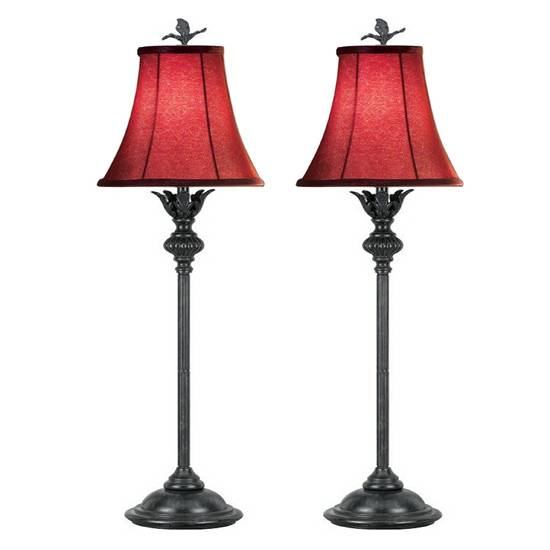 This pair of lamps is designed in a classical style. For each one, the lamp shade is red, presenting a trapezoid with curvy sides. On top of the lamp shade is a decorative pattern which resembles a flying bird when looked from a distance. The patterns on the stand enhance the elegance of the lamp greatly.