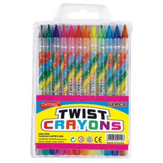 Presented here is a crayon set with a twist-up design. This crayon set is available in 12 assorted colors. Simply twist the bottom and you are ready to draw and write.