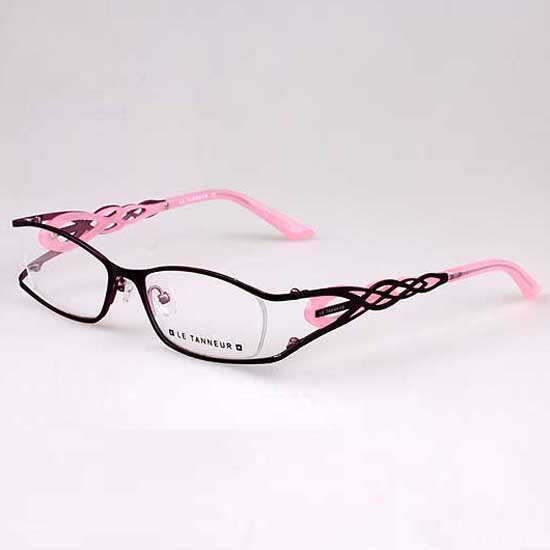 This spectacle frame comes with an intriguing, feminine design in pink and black. Intertwining knot patterns at the temples are classic and pretty. A partly rimless design highlights the eyes of the wearers.