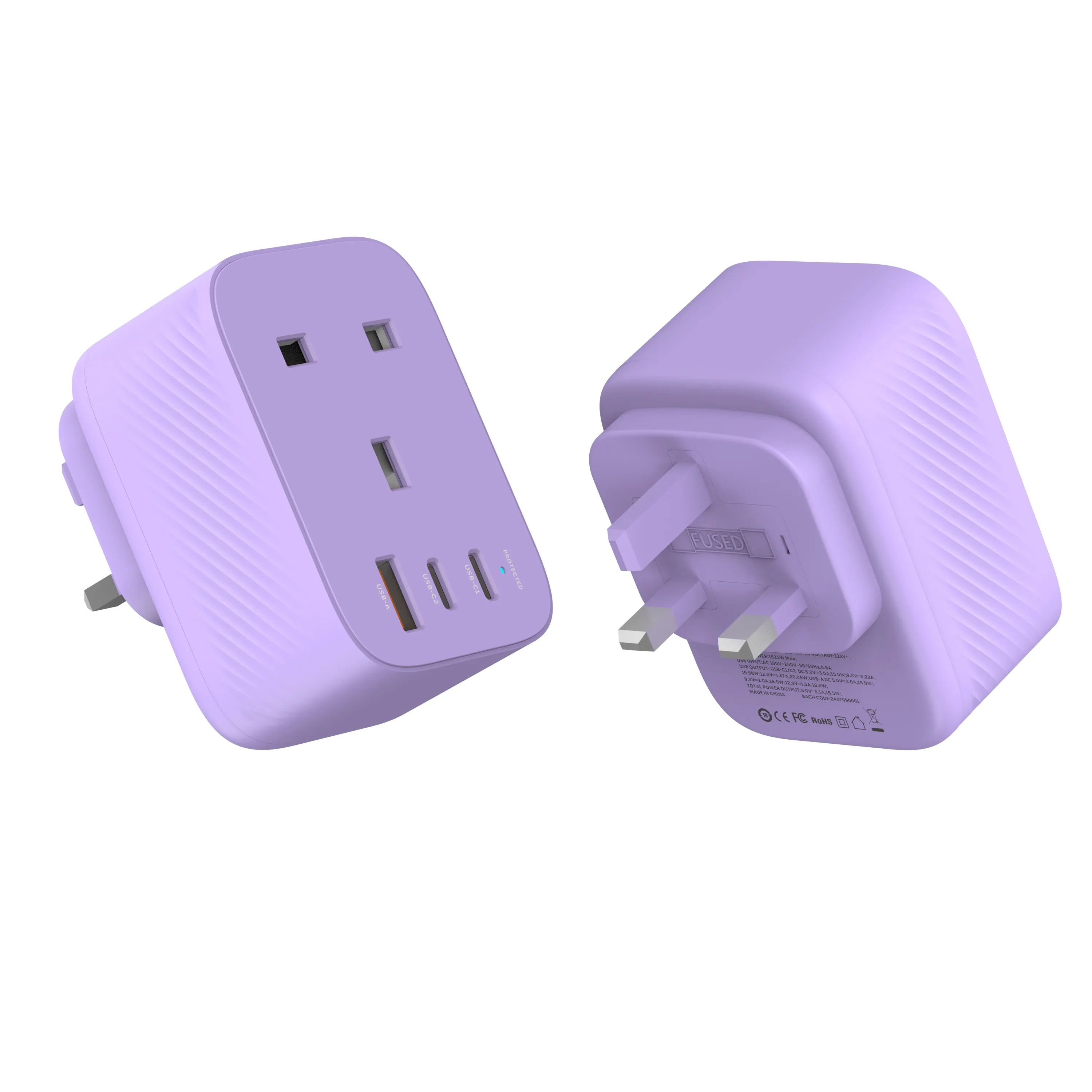 Travel plug adapter is a UK to UK mobile phone adapter that supports 20W fast charging, has one USB A output ports, and two USB Type-C ports. It comes in five colors, which are White, Purple, Blue, Green and Pink. PC 94V-0 FIREPROOF Material. Compact and portable, it is a good companion for travelers.