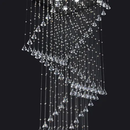 The ceiling-mounted crystal chandelier boasts a contemporary design. It is well made with exquisite craftsmanship and meticulous attention to details. This crystal chandelier is doubtlessly a fantasy of light and a piece of art to enrich the hotel lobby or ballroom.
